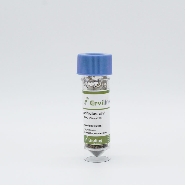 Erviline product contains Aphidius ervi, a tiny braconid wasp that stings and parasitizes large species of aphid. In an optimum condition a female can parasitize about 300 aphids in her lifetime. Parasitism is manifested by immobility and swelling of the aphid, which eventually turns into a light-brown mummy from which a new parasitoid emerges by piercing around, regular opening. Erviline is a complementary product for Aphiline, together these products parasitize a wide range of aphid pests.